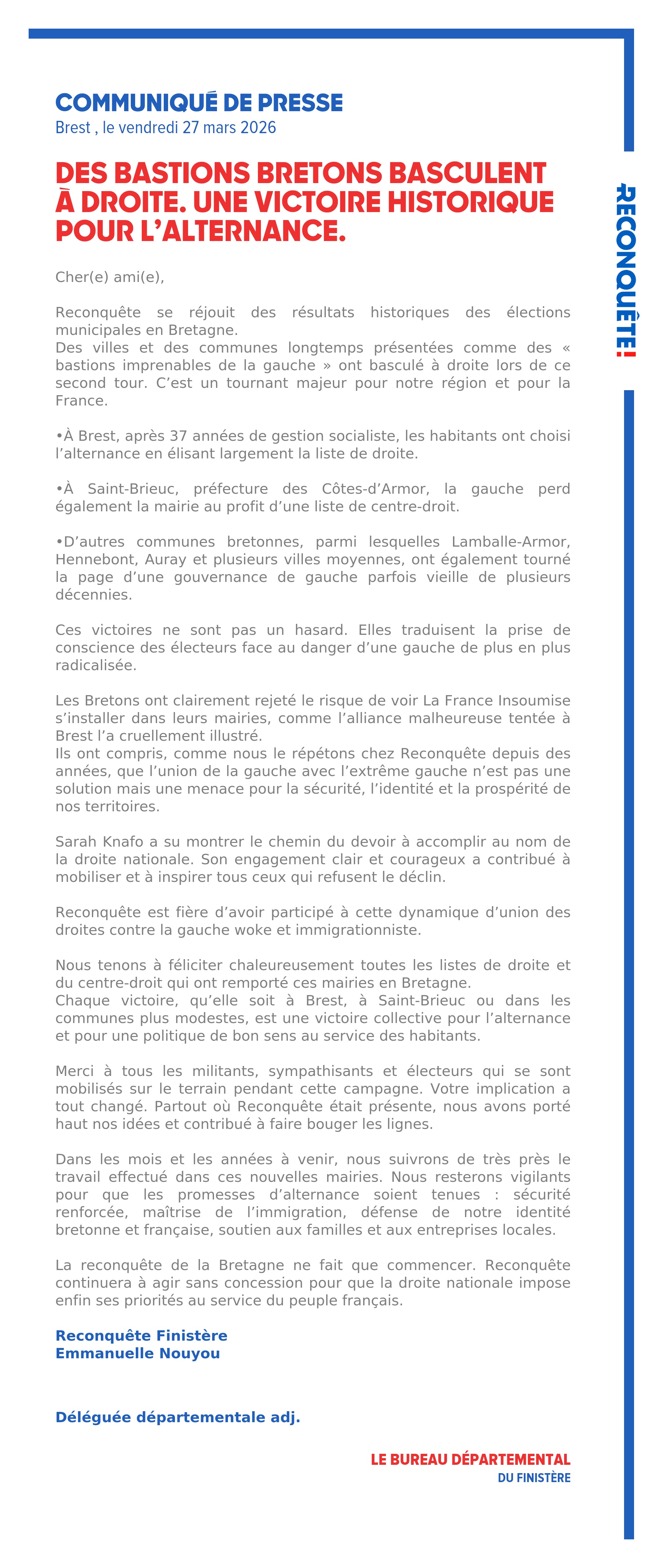 Dans les mois et les années à venir, nous suivrons de très près le travail effectué dans ces nouvelles mairies. Nous resterons vigilants pour que les promesses d’alternance soient tenues : sécurité renforcée, maîtrise de l’immigration, défense de notre identité bretonne et française, soutien aux familles et aux entreprises locales.