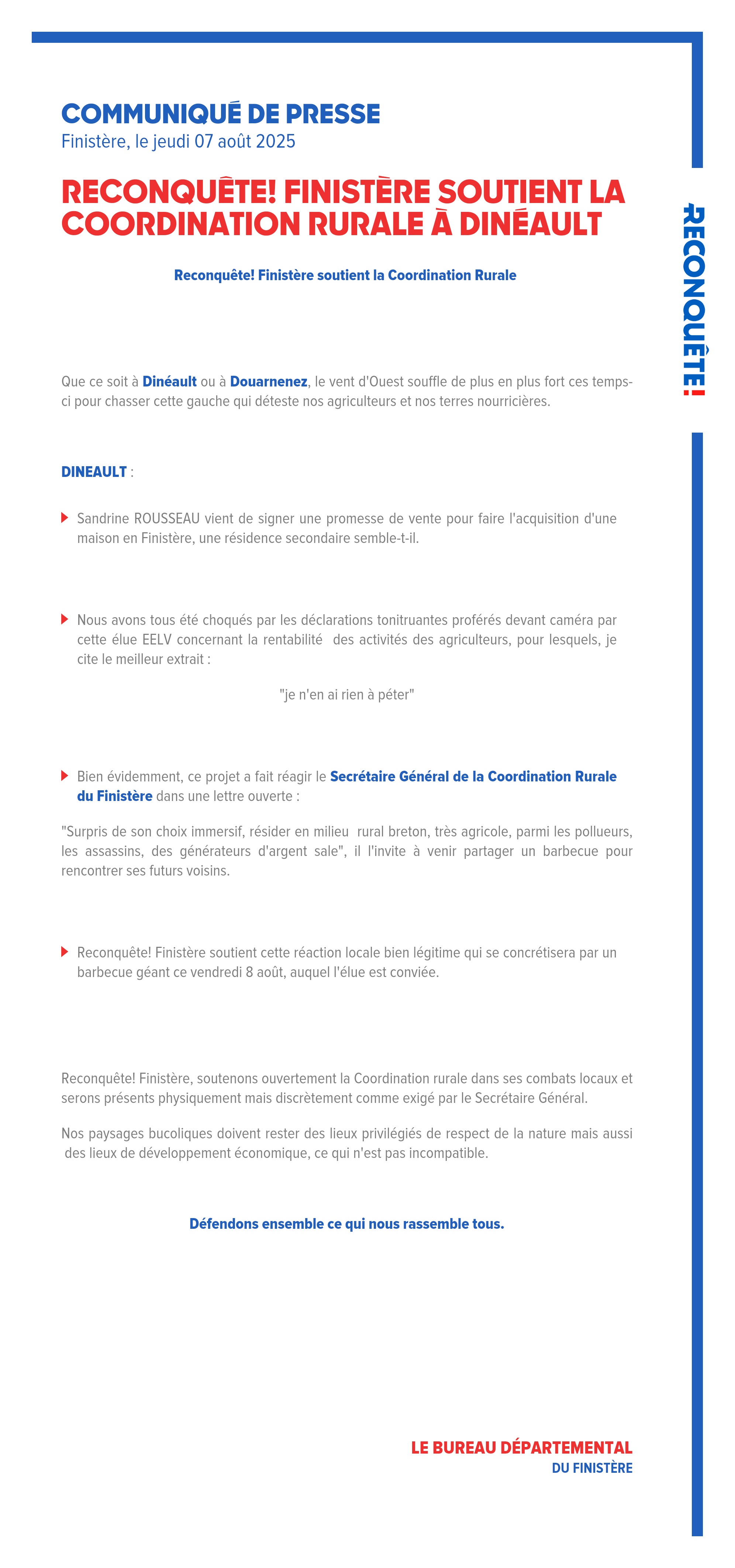 - Reconquête! Finistère soutient cette réaction locale bien légitime qui se concrétisera par un barbecue géant ce vendredi 8 août, auquel l'élue est conviée.